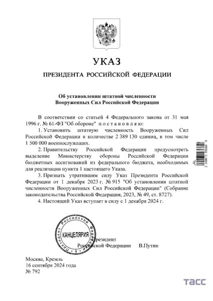 Описание: 📃 Текст указа президента России об установлении штатной численности ВС РФ. Штатная численность вооружённых сил устанавливается на уровне 2 389 130 человек, в том числе — 1 500 000 военнослужащих. В предыдущем указе этот показатель составлял 2 209 130 человек, в том числе 1 320 000 военнослужащих. Новый указ вступает в силу с 1 декабря 2024 года.