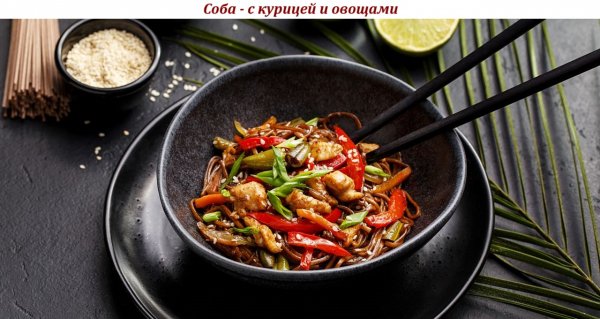 Описание: ♦ Соба - с курицей и овощами ♦Блюдо из гречневой лапши с куриным филе, перцем, морковью и пикантным соусом готовится очень быстро.Ингредиенты (на 2 порции):✔ Гречневая лапша (соба) - 150 г✔ Имбирь - 1 небольшой кусочек✔ Рисовый уксус - 2 ст. ложки✔ Соевый соус - 1 ст. ложка✔ Коричневый сахар - 1 ст. ложка✔ Кунжутное масло - 1 ст. ложка✔ Растительное масло - 2 ст. ложки✔ Филе куриной грудки - 1 штука✔ Сладкий перец - ½–1 штука✔ Морковь - ½ штуки✔ Чеснок - 2 зубчика✔ Соль - по вкусу✔ Хлопья красного перца - по вкусу✔ Кунжут - по вкусуМожно добавить:✔ Стручковая фасоль замороженная - по вкусуПриготовление (20 мин.):➦ Лапшу отварите примерно за 5 минут. Откиньте на дуршлаг.➦ Зелёную фасоль, если хотите её добавить, отварите за 2–3 минуты, откиньте на дуршлаг и ополосните холодной водой.➦ Имбирь натрите на мелкой тёрке — достаточно 1–2 чайных ложек. Смешайте с уксусом, соевым соусом, сахаром, кунжутным маслом и столовой ложкой растительного масла.➦ Курицу нарежьте небольшими кусочками, перец — соломкой. Морковь натрите на тёрке для моркови по-корейски или нарежьте соломкой. Чеснок пропустите через пресс.➦ В сковороде разогрейте столовую ложку растительного масла на среднем огне. Обжарьте курицу примерно за 4 минуты. Добавьте соль, перец, чеснок и подготовленный соус, помешивайте ещё минуту.✦ Время может немного меняться в зависимости от размера кусочков.➦ Добавьте в сковороду овощи. Помешивая, готовьте 1–2 минуты.➦ Выложите собу в сковороду. Перемешайте и через минуту-полторы снимите с огня.➦ Добавьте немного кунжута при подаче.