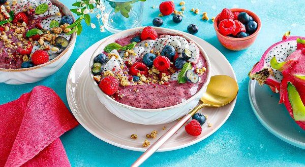 Описание: Смузи-боул — завтрак необычный, по-настоящему оригинальный. Вам понадобятся любые замороженные ягоды, которые оказались под рукой, любое молоко, немного мюсли и какой-нибудь экзотический фрукт. В нашем рецепте используется питахайя, но вы моете взять карамболь или манго. При желании можно использовать гранолу без глютена и сахара.Для приготовления 1 порции нужно:✔ питахайя — 1 шт.✔ банан — 1 шт.✔ ягоды замороженные (микс) — 150 г✔ молоко миндальное — 100 мл✔ мюсли печёные — 2 ст. л.Для подачи:✔ ягоды свежие✔ мята свежая Готовка: 10 минут1. Питахайю нарежьте тонкими ломтиками, банан — крупными кусочками.2. В чашу блендера положите банан и замороженную ягодную смесь, влейте миндальное молоко, взбейте до однородности. 3. Переложите смузи в глубокую миску, добавьте мюсли, ломтики питахайи, украсьте ягодами и мятой. Подавайте.