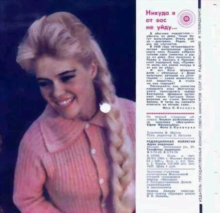 Кругозор- 08. 1965. 10 звуковая страница. Поёт Екатерина Шаврина - Скамеечка; Колокольчик; Я девчоночка молодая. Музыка Г. Пономаренко, стихи В. Бокова