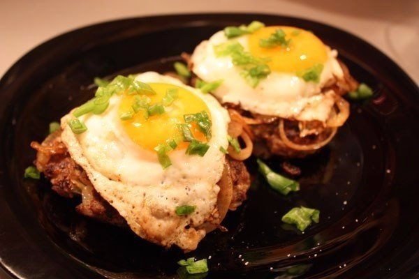Описание: Рубленый бифштекс по-гольштейнскиИнгредиенты:Фарш из говядины и свинины – 400 гЛук репчатый – 6 шт.Зелень – 50 гЯйца куриные – 5 шт.Зеленый лук – 50 гМасло сливочноеСольПерецПаприкаПриготовление:1. Очищаем лук, две луковицы нарезаем довольно мелко, остальные пока не трогаем.2. В мясной фарш кладем одно яйцо и нарезанный лук, добавляем соль и перец, очень тщательно вымешиваем.3. Зелень измельчаем и добавляем к мясу.4. Фарш делим на 4 равные части и формируем из каждой плоскую «котлету». Бифштексы должны получиться размером примерно с ладонь.5. Обжариваем бифштексы в сливочном масле с двух сторон до румяной корочки. Откладываем в сторону и оставляем в теплом месте, чтобы они не остыли.6. Оставшийся лук режем кольцами.7. Обжариваем его в сковороде, где жарилось мясо в течение 2 минут, помешивая. Он должен остаться слегка хрустящим.8. Бифштексы выкладываем на тарелку, сверху кладем жареный лук.9. Из яиц делаем яичницу-глазунью, разрезаем ее на 4 части так, чтобы в каждой был один желток, и выкладываем ее сверху на бифштексы с луком. Посыпаем зеленым луком.Приятного аппетита!