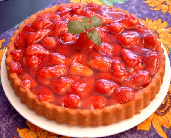 Описание: мука - 300 гсахар - 300 гсливочное масло - 150 гяйца - 3 шт.творог - 250 гразрыхлитель - 1 ч. л.Для начинки:клубника - 300-400 г"Желе для торта" или обычное желе - 1 пакетикСахар и яйца растереть добела. Добавить размягченное сливочное масло, взбить. Постепенно всыпать муку и разрыхлитель. Соединить с творогом, перемешать.Выложить тесто в смазанную маслом форму, выпекать 20 минут при 180 градусах. Остудить. Перевернуть на тарелку.Клубнику вымыть, разрезать пополам, выложить на пирог, залить разведенным "Желе для торта".Поставить в холодильник. Дать желе застыть.