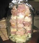 Описание: НЕОБЫКНОВЕННЫЙРЕЦЕПТ ШАШЛЫКА, БЕЗМАНГАЛА, БЕЗ УГЛЕЙ, БЕЗВЫЕЗДА НА ПРИРОДУИнгредиенты дляшашлыка в банке.свинина (антрекот) — 1кгбекон — 250 глук репчатый — 2-3 шт.сок ½ лимонавода — 100 млсольперецкориандрприправы для шашлыкаСпособ приготовленияшашлыка в банке.Мясо промыть ипорезать на небольшиекусочки.Добавить соль, перец,специи и сок лимона.Лук порезать кольцами идобавить к мясу,добавить воду. Оставитьмариноваться на 30минут.Бекон порезать тонкимиполосами.Нанизываем нашашлычные палочкимясо, чередуя с бекономи луком.На дно банки кладемоставшийся лук, вкаждую банку кладем4-5 «шампуров».Закрываем банкуфольгой.Важно! Банка должнабыть сухая снаружи.Отправляем в холоднуюдуховку (чтоб банка нелопнула), и ставим на180-200 С на 60-80минут.Немного остудим банку сшашлыком, неоткрывая духовку.Аккуратно открываемдуховку, чтоб приразнице температур нелопнула банка.Достаем потрясающеаппетитный шашлык!.ПРИЯТНОГО АППЕТИТА!!!