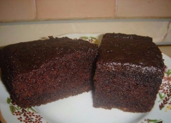 Описание: 1 ст. молока1 ст. сахара4 ст. л. какао (с верхом)1.Все ингридиенты смешать миксером. Так как я пекла ночью и все спали, просто поболтала венчиком.2.Смесь разделить на две части. В одну половину добавить:2 яйцасахар ванильный по вкусу1 ст. муки1 ст. л. разрыхлителя0,5 стакана подсолнечного масла.3.Всё смешать миксером. Форму смазать маслом, вылить смесь, которая с мукой и выпекать в нагретой до 180 градусов духовке, ~ 20-25 мин. Готовность проверяйте зубочисткой. Как будет сухая, значит готов.4.Горячий пирог залить второй частью смеси прямо в форме. Дать остыть и нарезать на порционные кусочки.5.Вот такую смесь я отправила в духовку.6.Готовый горячий пирог залила второй частью смеси.7.И оставила на ночь.