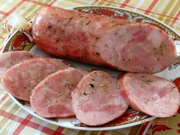Описание: Говядина 1,5кгБедра куриные 2кг (вес - разделанных бедер без косточек)Соль нитритная 75гБульон 350млМёд 1ст.л.Перец красный сладкий молотый 2ст.л.Перец чёрный крупно молотый 1ст.л.Мускатный орех 0,5ст.л.Чеснок молотый сушеный 1ст.л.Укропсушеный 1ст.л.Базилик сушеный 1ст.л.Перец черный горошком для бульонаОболочка для колбас (у меня полиамидная оболочка - калибр 60мм)1. Бедра куриные отделить от костей и кожи; Из костей сварить бульон в чуть подсоленной воде с добавлением перца черного горошком; Готовый бульон процедить и охладить в холодильнике.2. От говядины отделить половину - более жирную часть и вместе с кожей от бёдер пропустить через мясорубку с мелкой решеткой; Постную часть говядины и филе бедра порезать на кубики, размером примерно 2см.3. Фарш и рубленое мясо соединить, добавить мед, перемешать; В сухой посуде смешать соль и приправы, добавить смесь в фарш и, добавляя понемногу холодный бульон очень хорошо вымесить фарш;4. Полученным фаршем набить оболочку для колбас плотно, не допуская попадания воздуха, хорошо перевязав концы; если воздух кое-где попал проткнуть это место иголкой; Подвесить готовые батоны при комнатной температуре на 1-2 часа;5. Варить при 80-85 градусах (постепенно поднимая температуру) 1,5-2 часа (зависит от диаметра колбасы);6. Готовую колбасу быстро охладить под холодным душем, подвесить в прохладном помещении минимум на 8-10 часов; далее завернуть в бумагу и убрать в холодильник.