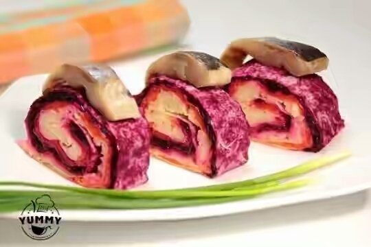 Описание: СЕЛЬДЬ ПОД ШУБОЙ В ЛАВАШЕ Ингредиенты:- Лаваш — 3 листа- Свекла — 2 шт.- Морковь — 2 шт.- Картофель — 4-5 шт.- Майонез- Филе сельди — 1 шт.Приготовление:1. Сварите овощи и очистите их от кожуры. Картофель разомните в пюре. Разрежьте каждый лист лаваша по сгибам на 4 части – так его удобнее использовать. Подложите под первый лист лаваша пищевую пленку или полиэтилен, смажьте лаваш тонким слоем майонеза. Используйте лаваш средней толщины – он хорошо пропитывается майонезом и держит форму. Слишком тонкий, почти прозрачный лаваш для этой закуски не подходит.2. Вареную свеклу остудите, натрите на крупной терке. Выложите на смазанный майонезом лаваш. Прижмите ладошкой.3. Сверху положите следующий лист лаваша, его тоже смажьте тонким слоем майонеза.4. Вареную морковь натрите на мелкой терке. Равномерно распределите по всему листу лаваша (краешки закрывайте начинкой).5. Уложите третий лист, промажьте лаваш майонезом.6. Картофельное пюре должно быть достаточно крутым, чтобы лаваш не размок. Разложите пюре, ложкой или ладонью прижмите его. Слой делайте не очень толстым, желательно, чтобы картофель лежал ровным слоем.7. Сверните лаваш рулетом. Сворачивать нужно по короткой стороне, чтобы слоев было больше.8. Заверните в пленку, краешки закрутите. Уберите лаваш в холодильник минимум на полчаса.9. Достаньте охлажденную закуску, нарежьте лаваш кусочками по 3–4 см. Выложите на блюдо. На каждый рулетик положите кусочек соленой сельди и украсьте закуску зеленым луком.