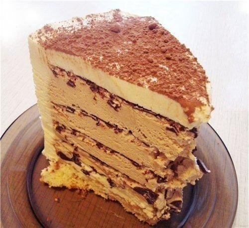 Описание: "Торт Кофе сшоколадом БЕЗДУХОВКИ"Ингредиенты:- Кофе черный крепкийс сахаром - 1/2 стакана- Печенье - 500 г- Сахар - 1 стакан- Яйца - 4 шт- Какао-порошок 1ст.л.- Сливочное масло - 250г- Ванильный сахар 1ч.л.Приготовление:1. Приготовлениекрема: сахар, яйца,какао-порошок иванильный сахарсмешайте, прогрейте наводяной бане дозагустения (постояннопомешивая). Смесьохладите и, добавляянебольшими порциямиразмягченное масло,взбейте до полученияоднородной массы.2. Смочите печенье вкофе и выложитеслоями в форму дляторта (желательноразъемную), смазываякаждый слой кремом.3. Поставьте вхолодильник дозастывания.Приятного аппетита!