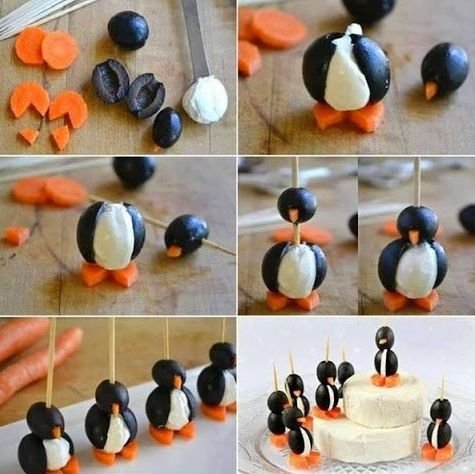 Маслины чёрные без косточек, морковь варёная, сыр творожный мягкий, зубочистка.