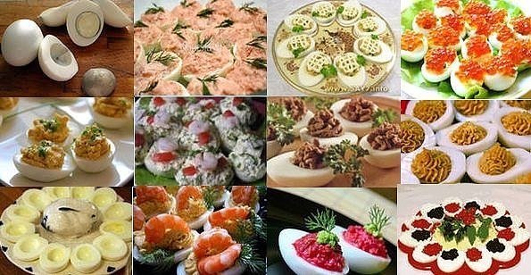 Описание: Рецептов очень много, наполнители для яиц разнообразные.Выбирайте на ваш вкус.Нужно только отварить яйца по числу гостей. Остудили и разрезали на две половинки.Остаётся только вынуть желток и добавить к нему нужную начинку.Начинки:1.Желток +майонез.2.Желток + обжаренные грибы + майонез.3.Желток + ветчина + майонез + зелень4.Желток + горбуша + маринованный перец + майонез.5.Желток + шпроты + горчица.6.Желток + селёдка + майонез.7.Желток + чеснок + сыр.8.Желток + зелень + майонез.9.Желток + брынза + кетчуп.10.Желток + грецкие орехи + кинза + чеснок.11.Желток + сёмга + майонез.12.Желток+красная икраПриятного вам аппетита!