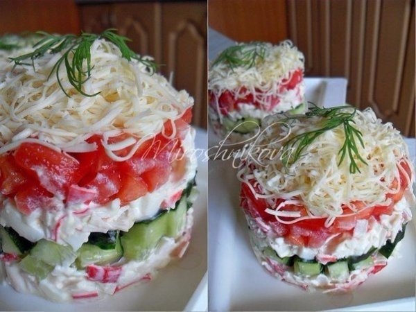Описание: Безумный салатИнгредиенты на 2 порционных салата:Крабовые палочки-200 гр.Яйцо вареное-2 шт.Свежий огурец небольшой-2 шт.Помидоры средние-2 шт.Сыр-60 гр.Майонез-3 ст.ложкиПриготовление:Огурцы и помидоры нарезать небольшими кубками. Сыр натереть на мелкой терке.Яйца измельчить,крабовые палочки нарезать кубиками,добавить майонез,перемешать.Выложить слоями:1-крабовые палочки с яйцом2-огурцы3-крабовые палочки с яйцом4-помидоры5-сырУкрасить по желанию