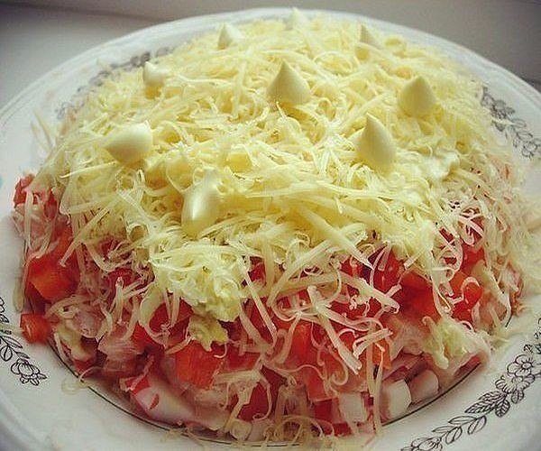 Описание: ИНГРЕДИЕНТЫКрабовые палочки 400 гр ( в идеале креветки)Перец болгарский (красный,мясистый) 1 шт. (крупный)Помидоры 2 шт. Яйца 2 шт.Сыр твердых сортов 100 гр .Майонез.СПОСОБ ПРИГОТОВЛЕНИЯБолгарский перец очистить от сердцевины и нарезать кубиками,уложить в салатник.Смазать тонким слоем майонеза.Далее кладем нарезанные кубиком крабовые палочки,опять тонкий слой майонеза.Следующий слой: тертые яйца,нарезанные кубиком помидоры и тонкий слой майонеза.И заключительный слой из тертого сыра.Оформить по желанию.Приятного аппетита!