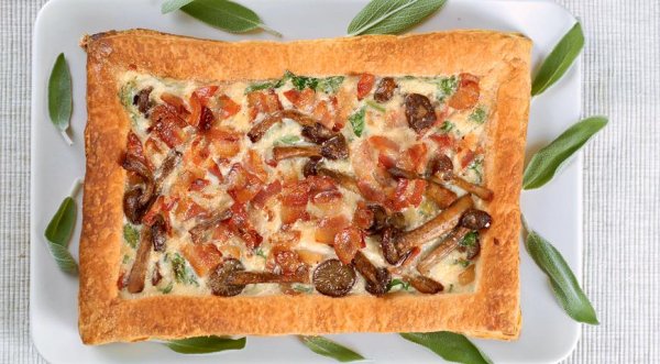 Описание: веточки петрушки – 3 шт.лесные грибы (можно замороженные) – 150 гсметана – 100 млслоеное бездрожжевое тесто – 500 гяйцо (желток) – 1 шт.копченый бекон – 200 гяйцо – 6 шт.Бекон нарезать неболшими кусочками и обжарить на сухой разогретой сковороде до хруста.Шумовкой переложить шкварки в миску. В эту же сковороду выложить замороженные грибы, обжарить, помешивая время от времени в течение 10 мин или дольше - в начинке не должно быть много жидкости. Когда грибы обжарятся, снять сковороду с огня и дать остыть.Тесто слегка раскатать в прямоугольник, выложить на смазанный маслом противень. Отступив 3 см, сделать острым ножом вдоль краев надрезы, не прорезая тесто до самого низа. Внутри получившейся границы сделать ножом мелкие насечки. Смазать тесто желтком и поставить в разогретую до 180 °С духовку на 10 мин.Вынуть противень из духовки, уменьшить температуру до 160°С. Аккуратно примять внутреннюю часть теста.Петрушку вымыть, обсушить и нарезать. Взбить яйца со сметаной в однородную массу, добавить шкварки бекона, обжаренные грибы и зелень. Перемешать.Выложить приготовленную начинку на пирог и поставить в духовку еще на 15–20 мин.