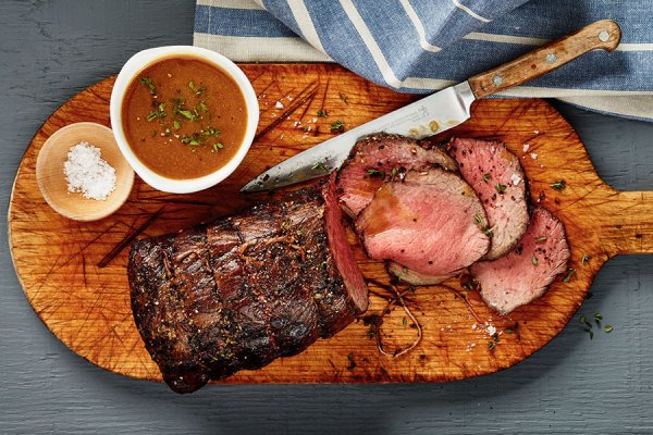 Описание: говяжья вырезка – 2 кггорсть листьев базиликатолченый чеснок – 3 зубчикавустерский соус – 5 ст. л.сахар – 0,5 стаканасоль – по вкусумасло растительное – 1 лщепотка ореганосоевый соус – 0,5 стаканаДля соуса:зернистая горчица – 1 ст. л.майонез – 300 млкайенский перец – 0,25 ч. л.вустерский соус – 0,5 ч. л.Вырезку очистить от пленок и положить в миску. Смазать со всех сторон растительным маслом и дать постоять 10 мин.Приготовить карамель. Всыпать сахар в кастрюлю, влить 4 ст. л. холодной воды и готовить, помешивая, на сильном огне 7 мин.Вырезку натереть солью и перцем. Разогреть в сковороде 3 ст. л. масла и обжарить мясо на сильном огне со всех сторон до коричневой корочки, 15 мин. Затем поместить в разогретую до 180 °С духовку и довести до готовности, 5–7 мин.Чеснок очистить и раздавить. Оставшееся растительное масло, соевый и вустерский соусы влить в большую прямоугольную форму. Добавить орегано, листья базилика и чеснок. Облить всю внутреннюю часть формы карамелью.Положить горячее мясо в маринад так, чтобы он полностью покрывал вырезку. Мариновать при комнатной температуре не менее 7 ч, часто переворачивая.Для соуса взбить в маленькой миске майонез, горчицу, вустерский соус и перец. Готовый ростбиф обсушить бумажным полотенцем и тонко нарезать поперек волокон.Подать к столу вместе с соусом.