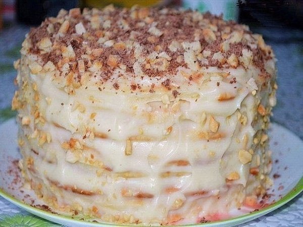 Описание: Ингредиенты:1 яйцо200 гр творога1 ст сахараванилинпримерно 300 гр муки1 ч л гашеной соды.Крем:500 мл молока1 яйцо1 ст сахара3 ст л мукиванилин150 гр сливочного масла.Орехи 150 гр.Как готовить:1. Для крема перетираем яйцо с сахаром и мукой. Смешиваем массу с ванилином. Добавляем молоко и перемешиваем тщательно все венчиком. Варим на минимальном огне, пока крем не станет густым. Даем ему остыть.2. Растираем творог и сахар. Добавляем яйцо и ванилин. Просеиваем соду и муку. Замешиваем тесто. Формируем из теста 6-8 лепешек и раскатываем в коржи по диаметру сковородки. Прокалываем в нескольких местах вилкой.3. Обжариваем до румяной корочки на сковородке.4. Сливочное масло взбиваем миксером постепенно добавляя к нему крем. Смазываем коржи кремом и украшаем крошкой от обрезки кривоватых коржей, и орехами.5. Ставим торт на 6-8 часов в холодильник и подаем к столу.Приятного аппетита!