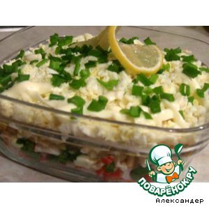 Описание: 200гр. - крабовое мясо1шт. - плавленый сырок1шт. - яблоко1пучок зелёного лука2шт. - яйцо куриное100гр. - сметана 100гр. - майонез Мелко режем крабовое мясо.На мясо зелёный лук, можно и репчатый,обдав кипятком.Смазать смесью сметаны и майонеза.На лук том яблоко,лучше кислое.На яблоко том сырок и снова заправка.Сверху яйца и украшаем по вкусу Салат состоит из слоёв,но если всё перемешать, будет ещё вкуснее.
