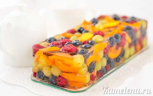 Описание: Ягоды и фрукты:200 г малины200 г голубики200 г винограда200 г абрикосов200 г нектаринов50 г красной смородиныЖеле:600 мл прозрачного сока (см. ниже)1,5 пакетика желатина (15 г)сахар или пудра по вкусуФрукты порезать тонкими дольками.Добавить ягоды.Очень аккуратно перемешать.Желатин предварительно замочить в 50 мл сока, оставить для набухания. Затем нагреть до горячего состояния, чтобы желатин растворился. Остудить. Влить желатин к остальному соку при помешивании. При необходимости, если у вас сок не сладкий, подсластите его сахаром.Подготовить форму, если форма разъемная, то тщательно обернуть фольгой, чтобы не протекало. Можно по желанию использовать порционные силиконовые формочки. Выложить фруктово-ягодную смесь.Залить соком и поставить в холодильник до полного застывания.Прогреть феном стенки или провести ножом, и аккуратно снять форму.Нарезать толстыми ломтиками с помощью тонкого острого ножа.Фруктово-ягодный террин это отличный легкий десерт для жаркого летнего дня!