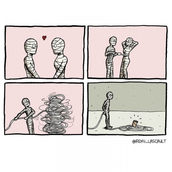 Описание: Французский художник Реми Ласко прославился в интернете тем, что создаёт абсурдные комиксы обо всём на свете. Иллюстрации из четырёх кадров всегда заканчиваются неожиданно и буквально пропитаны чёрным-чёрным юмором.
