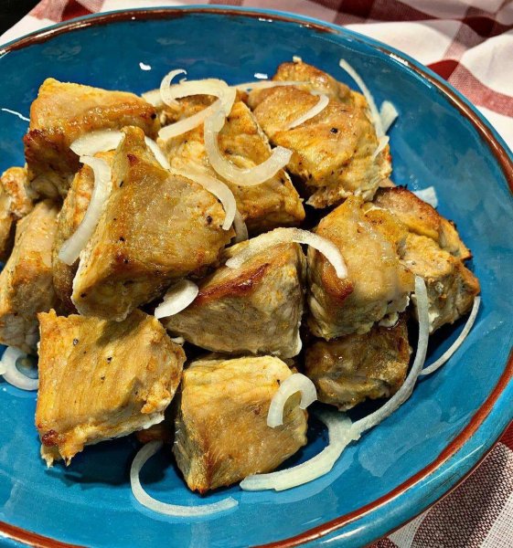 Описание: Шашлык из свинины в духовке🔥 Ингредиенты:Свиная шея-1 кгЛук-2 шт (среднего размера)Соль,перец,паприка-по вкусуУксус-3-4 ст.лВода-2 стаканаПриготовление:Мясо нарежьте на кусочки.Положите в миску,добавьте специи по вкусу.Лук нарезать полукольцами,добавить к мясу и помять все хорошо руками.Добавить уксус с водой,перемешать.Оставить мариноваться на 2 часа.Противень застелить фольгой,выложить на него мясо без лука.Отправить шашлык в духовку на 60 минут при температуре 200 градусов.Приятного аппетита!
