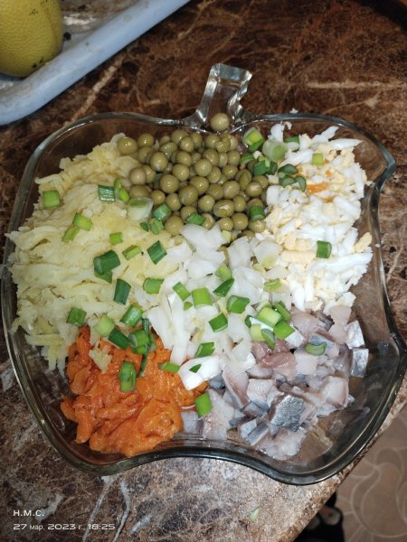 Описание: Салат с селедкой.надо: филе одной соленой селедки( у меня 2 половинки матье); 2 вареных яйца;1 небольшая вареная морковь;3 некрупные вареные картошины; 1/3 банки горошка; половинка небольшой луковицы.для заправки : 1 стол.л. зерненой горчицы без верха, полстакана сметаны или майонеза, капля лим. к-ты или уксуса, соль по вкусу.Смешать и заправить салат перед подачей.селедку и лук мелко нарезать, остальное на крупную терку.