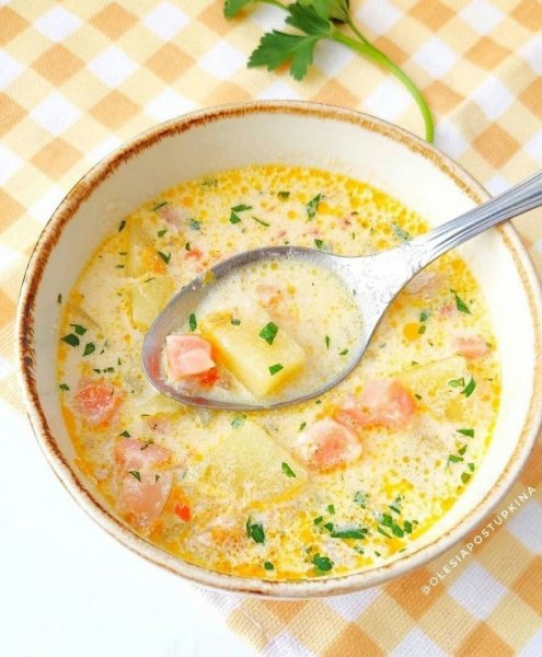 Описание: Ингредиенты: - 50г форели, у меня была слабосолёная, можно свежую или консервы, например горбушу - 100г 10% сливок - 170г картофеля - 50г лука - 50г моркови - 30г сладкого перца - 5г подсолнечного масла - 500 мл воды - зелень для подачи - соль, перец - по вкусу. ⠀ Приготовление: Воду поставить нагреваться, картофель нарезать кубиками и закинуть в кипящую воду. Лук мелко нарезать, морковь натереть, перец нарезать кубиком, обжарить на масле. Добавить к картошке. Когда картофель будет почти готов, добавить нарезанную рыбу и варить 5 минут на среднем огне, посолить, поперчить. Добавить сливки, прогреть. Перед подачей посыпать зеленью. ⠀ Обращаю ваше внимание: получается две небольшие порции, если вам надо больше, то увеличиваете вес ингредиентов.