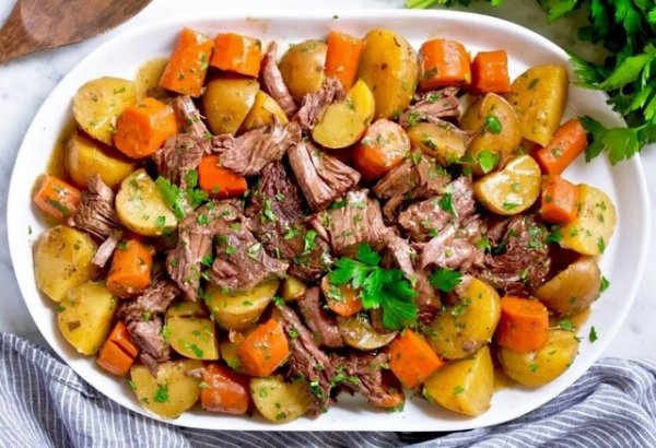 Описание: Понадобится: Телятина или говядина на кости (лопатка/ребрышки/грудинка) - 2 кг, картофель небольшого размера - 1.2 кг, морковь - 600 г, репчатый лук - 2 средних луковицы, сельдерей черешки или корень - 150 г, вино белое сухое или полусухое - 300 мл, сливочное масло - 100 г, оливковое масло - 70 мл, чеснок - 30 г, петрушка зелень - 30 г, петрушка сушеная - 3 г, лавровый лист - 2 шт., прованские травы - 3 г, соль и перец - по вкусу, мука пшеничная - опционно, кипяток - опционно. Мясо зачистите и обсушите бумажным полотенцем. В кастрюле с толстым дном разогрейте оливковое масло. Обваляйте телятину в муке и выложите в кастрюлю. Обжаривайте телятину частями. Нужно поджарить каждый кусочек до румяной корочки. Если на донышке кастрюли будут прижарки, не беспокойтесь, но следите, чтобы эти прижарки не подгорели. Всю обжаренную телятину сложите в кастрюлю и влейте в мясо вино. Увеличьте нагрев, чтобы вино закипело. Дайте мясу пропариться в вине. Активно перемешивайте кусочки мяса, чтобы каждый кусочек попал в вино. Как только вино выпарится наполовину, залейте мясо кипятком. Вода должна покрыть все кусочки и быть вровень с мясом. Положите в кастрюлю очищенные луковицы, сельдерей, одну морковку и специи. Посолите по вкусу и доведите бульон до кипения. Когда все закипит, уменьшите огонь, накройте кастрюлю крышкой и томите около 2.5 - 3 часов. Через 2 часа удалите лук и коренья. Картофель промойте и нарежьте дольками. Если шкурка у картофеля тонкая, ее можно не счищать. Морковь почистите и нарежьте крупными кусками, размером с куски картофеля. В сковороде растопите сливочное масло и обжарьте в этом масле морковь до легкого зарумянивания. Присыпьте морковь прованскими травами и снимите сковороду с огня. Чеснок и зелень петрушки измельчите. Сыр натрите на терке. Когда мясо начнет отходить от костей, разберите его на куски, удалив жилки и кости. Удобней всего вынуть мясо из кастрюли, удалить косточки и вернуть тушеное мясо обратно. Посыпьте мясо половиной рубленного чеснока и добавьте к нему картофель. Все томите на небольшом огне. Когда картофель будет почти готов, добавьте к нему морковь вместе с маслом и специями. Проварите все до готовности картофеля. Снимите кастрюлю с огня и слейте из кастрюли бульон в сотейник. Соус. Желток куриного яйца - 2 шт., сыр полутвердый типа Грюйер - 100 г, вино белое сухое - 100 мл. Добавьте к бульону оставшийся чеснок, желтки, натертый сыр и вино и на маленьком огне проварите все до загустения. Подавайте мясо с картофелем и морковью, посыпав все рубленной петрушкой. Отдельно подайте соус и поджаренные гренки из пшеничного хлеба.