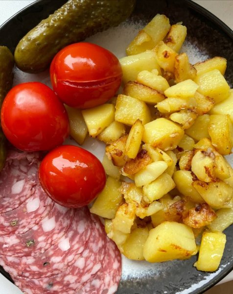 Красивый закусон картошечка колбаска помидорчик и огурчик