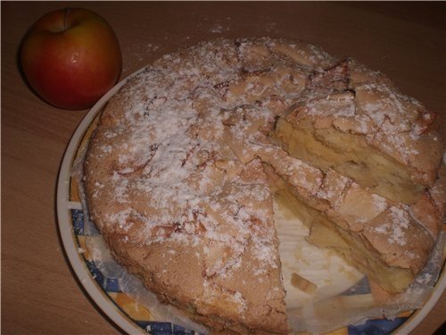 Описание: Яблочная шарлотка.Шарлотка очень нежная и сочная внутри и с хрустящей румяной корочкой снаружи.Ингредиенты: 4 яйца (большие); 200 гр сахара; пакетик ванильного сахара; 200 гр муки; 3 крупных яблока Приготовление: Яйца взбить с сахаром и ванилином. Взбивать долго и тщательно (около 10 минут, затем добавить муку и взбивать ещё раз около 1 минуты), пока масса не станет белого цвета. Яблоки очистить от кожуры и порезать тонкими ломтиками. Форму для выпечки смазать маслом и посыпать мукой, на дно формы выложить половину нарезаных яблок, залить тестом и сверху разложить остальные яблоки. Запекать в хорошо разогретой духовке при 180 градусах около полу часа. Перед тем как вынимать из духовки проверить зубочисткой или спичкой на готовность.