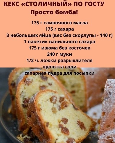 Описание: КЕКС «СТОЛИЧНЫЙ» ПО ГОСТУ Просто бомба! Попробуйте обязательно! ⠀ ⠀ 1. Взбить размягченное масло с солью, сахаром, ванильным сахаром в пышную массу. ⠀ 2. По одному добавить яйца, тщательно взбивая. ⠀ 3. Всыпать промытый и обсушенный изюм, перемешать. ⠀ 4. Добавить просеянную с разрыхлителем муку и замесить тесто. ⠀ 5. Выложить тесто в форму, смазанную маслом и посыпанную мукой форму (прямоугольную размером 10х20 см либо с круглую с дыркой), и влажной лопаточкой прорезать посередине. ⠀ 6. Выпекать при 160 С около 80-100 минут. ⠀ 7. Готовый кекс остудить на решетке. ⠀ 8. И еще теплый посыпать сахарной пудрой. _________________ Домашний кулинар