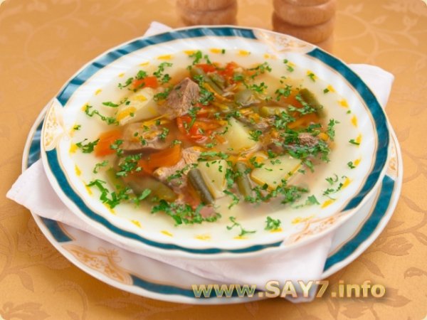 Описание: Ингредиенты:500 г говядины500 г картофеля300 г стручковой фасоли (я использовала замороженную)300 г помидоров150 г лука150 г моркови2-3 зубчика чеснокасольперецрастительное маслозеленьРецепт приготовления:Количество ингредиентов указано на четырехлитровую кастрюлю. Мясо нарезать небольшими кусочками. Мясо залить водой, посолить, поставить на огонь, варить 1 час. Лук мелко покрошить. Морковь натереть на средней терке. Помидоры нарезать кубиками. Обжарить лук на растительном масле. Добавить морковь, обжарить. Добавить помидоры, обжаривать 5-7 минут. Картофель почистить, нарезать кубиками или брусочками. В бульон добавить картофель, варить 5 минут. Затем добавить фасоль, варить 5-7 минут. Добавить обжаренные лук, морковь, помидоры. Если необходимо, еще посолить, поперчить. Варить до готовности картофеля. Затем добавить выдавленный через чеснокодавку чеснок, накрыть крышкой. Дать постоять 20-30 минут. Суп разлить по таре