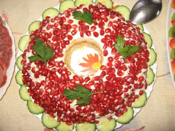Описание: состав: яблоки 2шт, , лук репчатый, картофель, морковь, курочка (ветчина), яйца,гранат,майонез,соль. 1слой - картофель, 2слой - яблоко, 3 слой - морковь, 4 слой - курица, 5 слой - жареный лук, 6 слой - яйца, 7 слой - курочка, 8 слой - яблочко. Салат хорошо смазать майонезом и сверху посыпать гранатом.Всем приятного аппетита!!!!!!