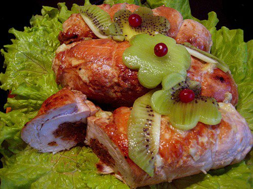 Описание: Куриный рулет, украшенный для подачи. Это блюдо можно приготовить из различных частей курицы с разнообразными начинками. Рулеты часто готовят из куриного филе или бедер. В качестве начинки могут использоваться грибы, сыр, овощи или сухофрукты. Блюдо запекают в духовке, иногда оборачивая беконом для получения аппетитной корочки. На фото рулет украшен ломтиками киви и ягодами, что придает ему праздничный вид.