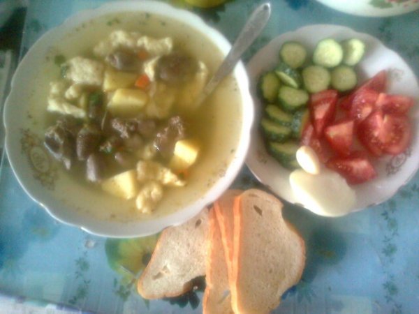 Описание: Люблю горячий, свежий супец в обед схомячить!!!Так как в бытность свою, будучи женатым, а также проживая в гражданском браке, столкнулся к тем, что очень трудно заставить представительниц слабого пола, сварить нечто подобное, то научился всему сам... И неплохо в этом мастерстве поднаторел...И мои женщины все как один, сломя голову летели на кухню когда я орал: "Суп готов!! " :)))))))))))))И так - суп "Мечта Жеглова", котрый я приготовил час назад:я взял 200 грамм куриных сердец, 200 грамм печени куриной, промыл и в кастрюлю, варю до закипания и потом минут 5 они кипят, сливаю воду, промываю и снова заливаю свежей водой... Как закипят снова бросаю - лаврушку, перец (душистый и горошек), соль, хмели-сунели, орегано, и специя "10 трав" (все это по пол чайной ложки), немного красного молотого перца...Зажарка - лук и морковь на маленьком огне минут 10, потом туда 3 ложки столовых из кастрюли лью и еще минут 10...40 минут варится суп - зажарку туда и картошку...Потом ложек семь из супа в миску, туда муку, одно яйцо, соль, сахар - все замешиваю и макая чайную ложку в суп, черпаю тесто и бросаю в кастрюлю. Это наши галушки!!!Финал этого действа - мелко порезанная петрушка!! Огонь выключен, минут 20 пусть настоится и вперед!!! Время готовки - 1 час!! :)))) Время удовольствия - как минимум сутки, в зависимости от количества членов семью и аппетита!! :))"Эх, сейчас бы Шарапов супа!! Да с потрошками!!" (с)